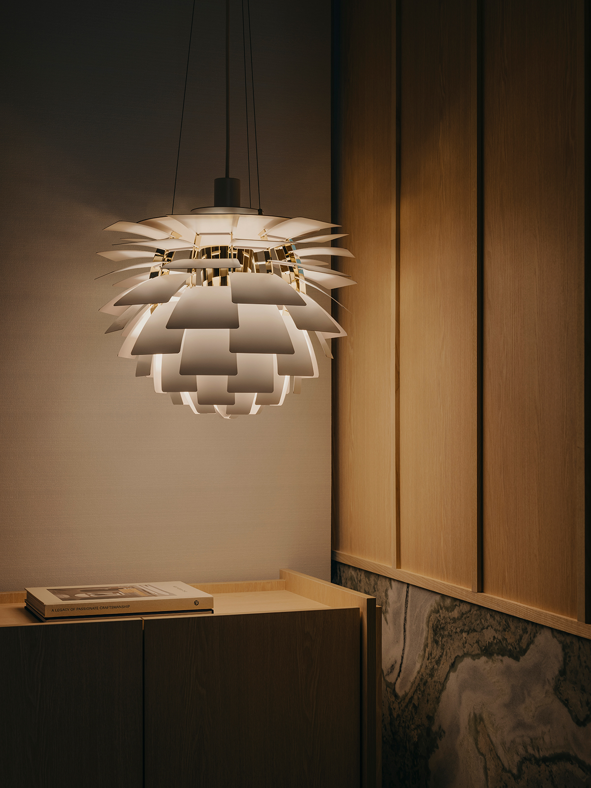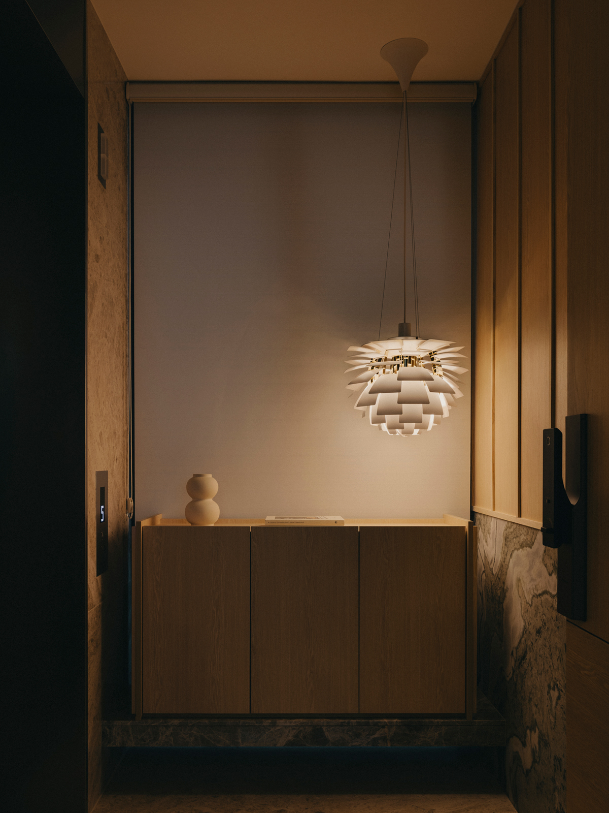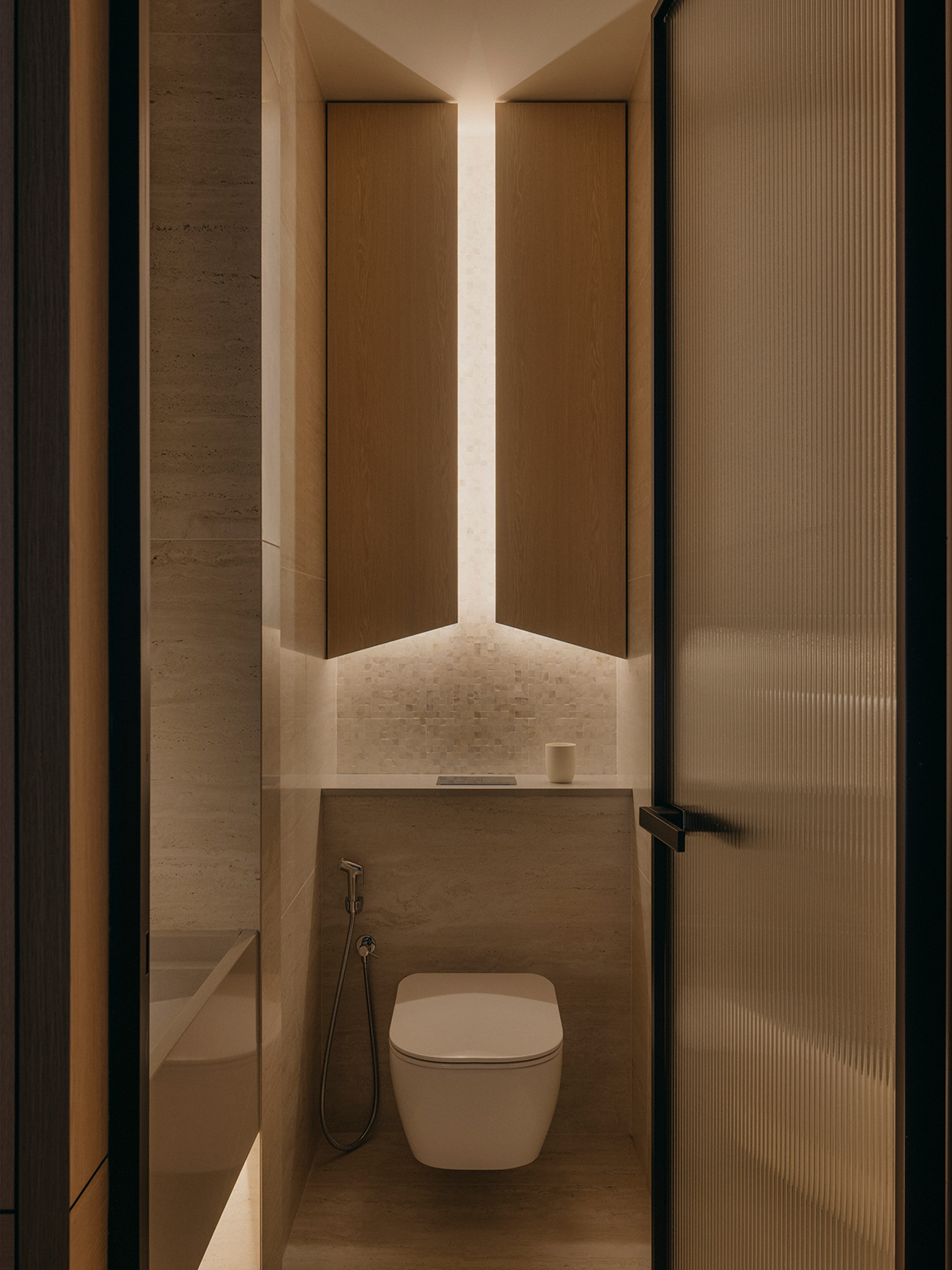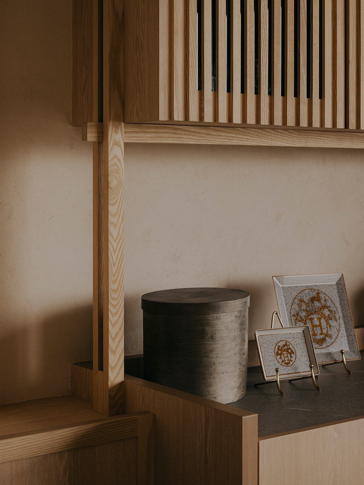 Intricate layers of fluted detailing and ceiling articulation imbue the home with cohesive composure, reflecting the studio’s dedication to meticulousness and tactility.