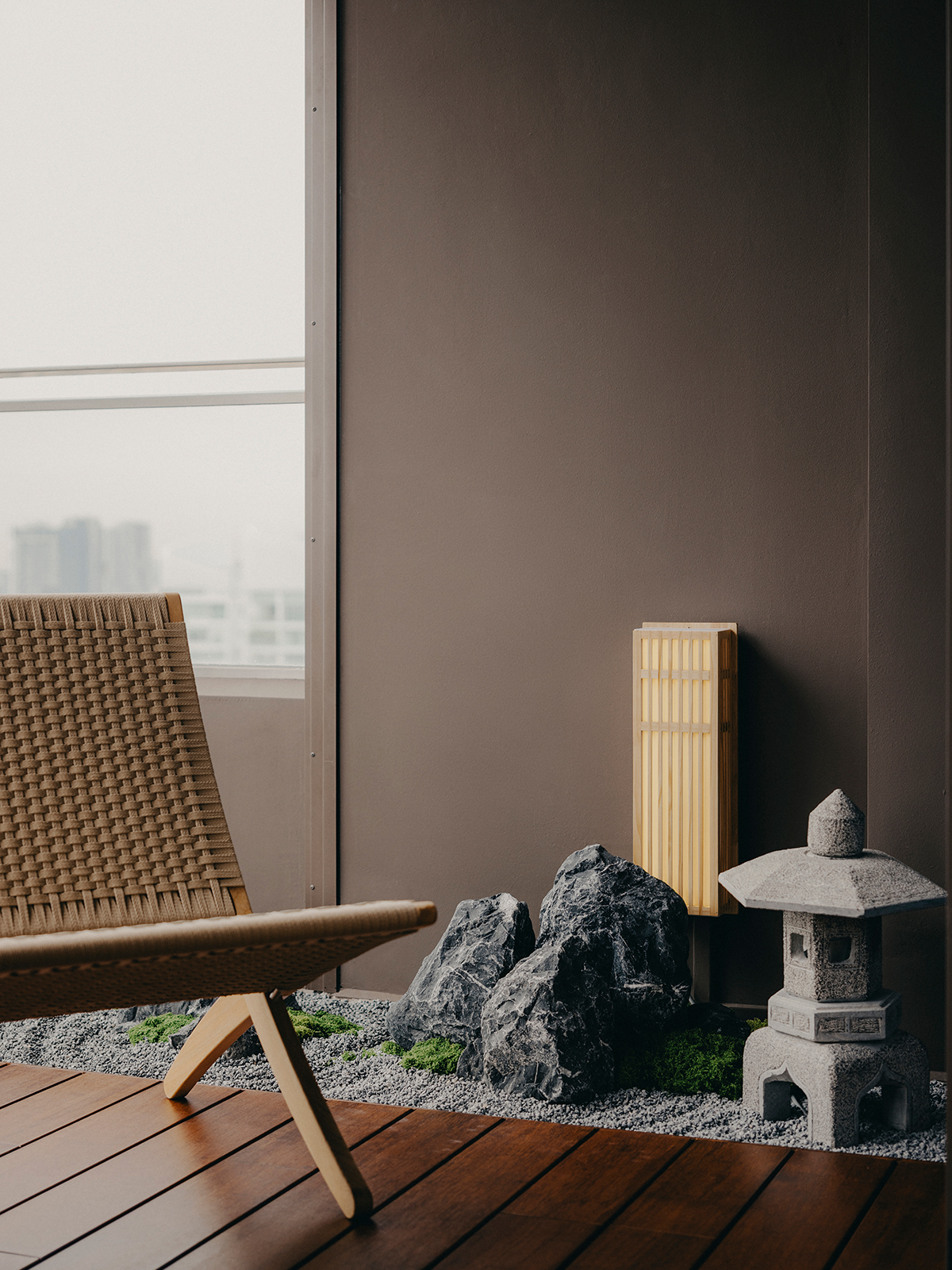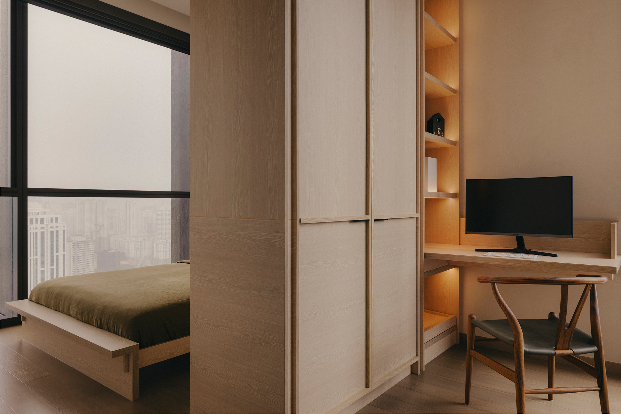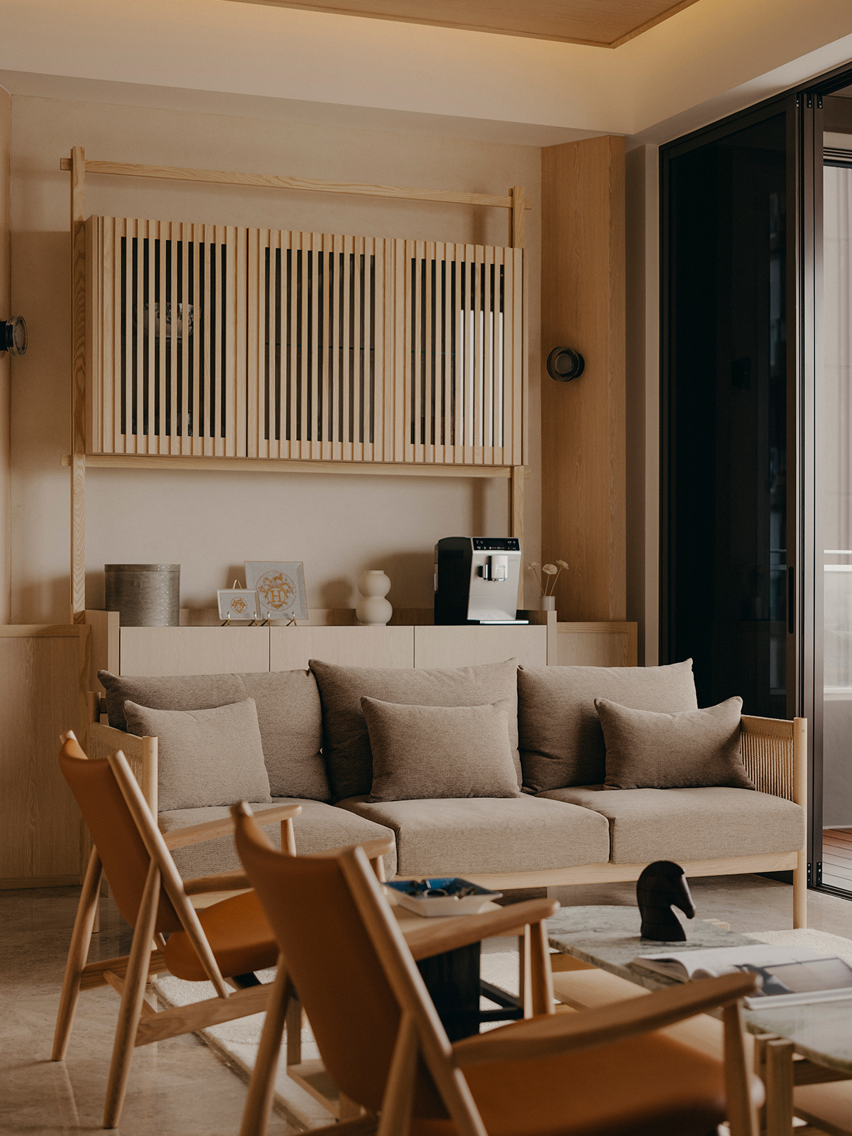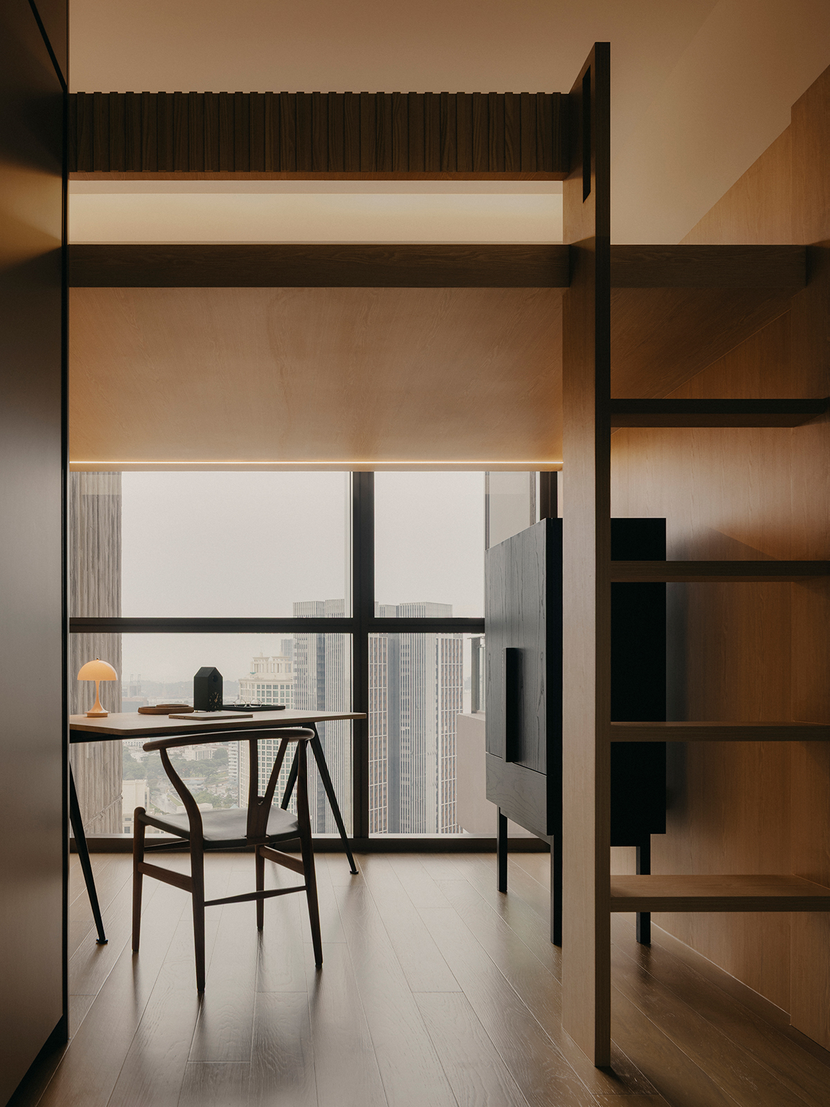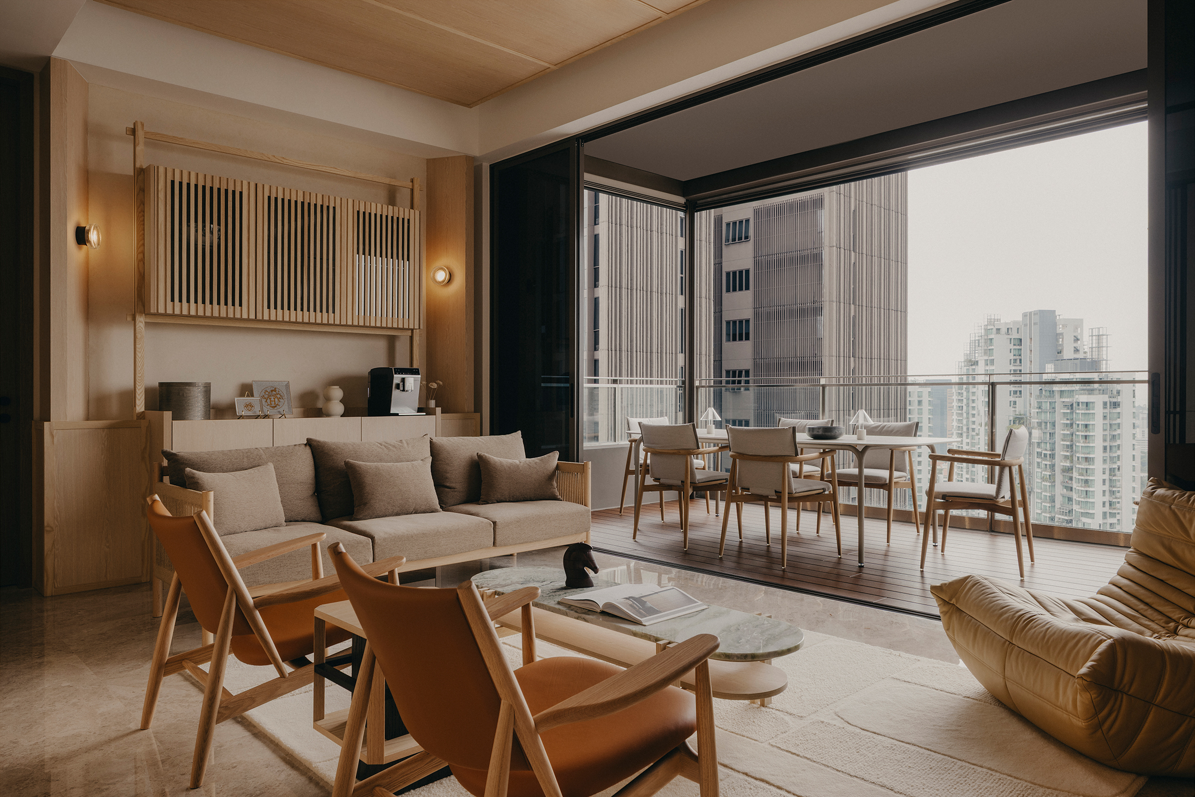 Across its expanse, the apartment’s primary zone is framed by a pair of slanted fins flanking both ends—an intentional gesture that delineates and elongates the spatial axis. One side accommodates the entertainment ensemble, while the other features an intricate pantry, extending hospitality beyond the kitchen. Together with a composition of sculptural furnishings, the living and dining areas unfold as a continuous pavilion, flowing seamlessly into a zen balcony garden with sweeping city views.