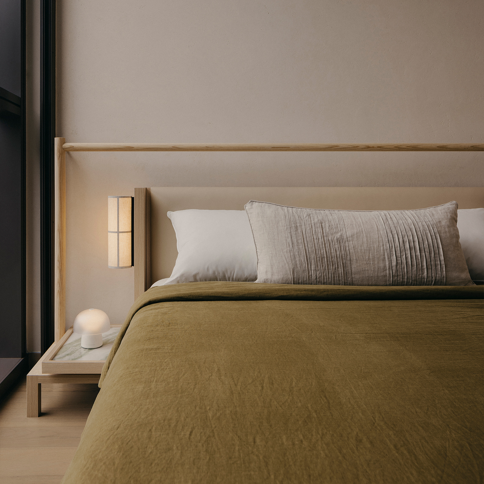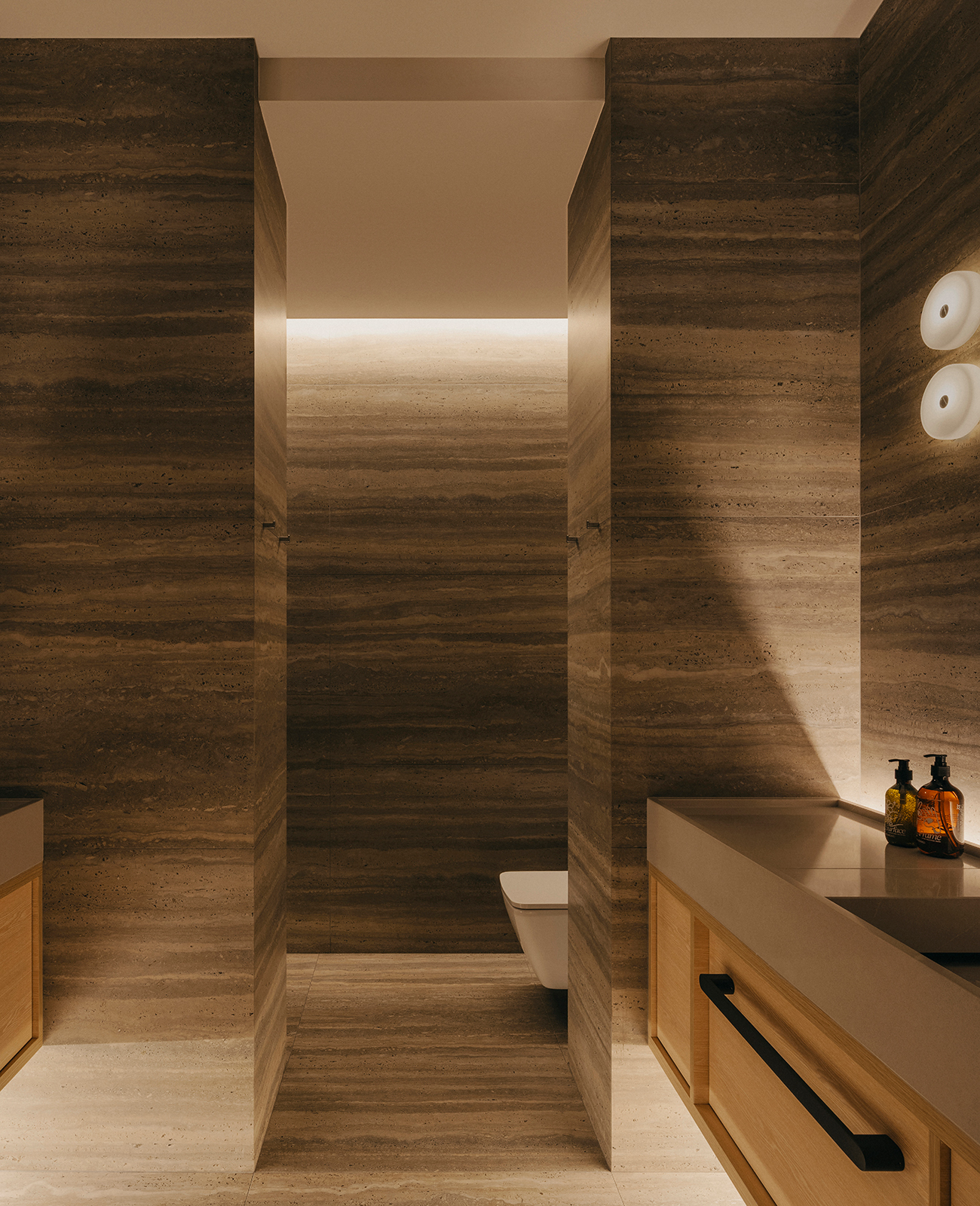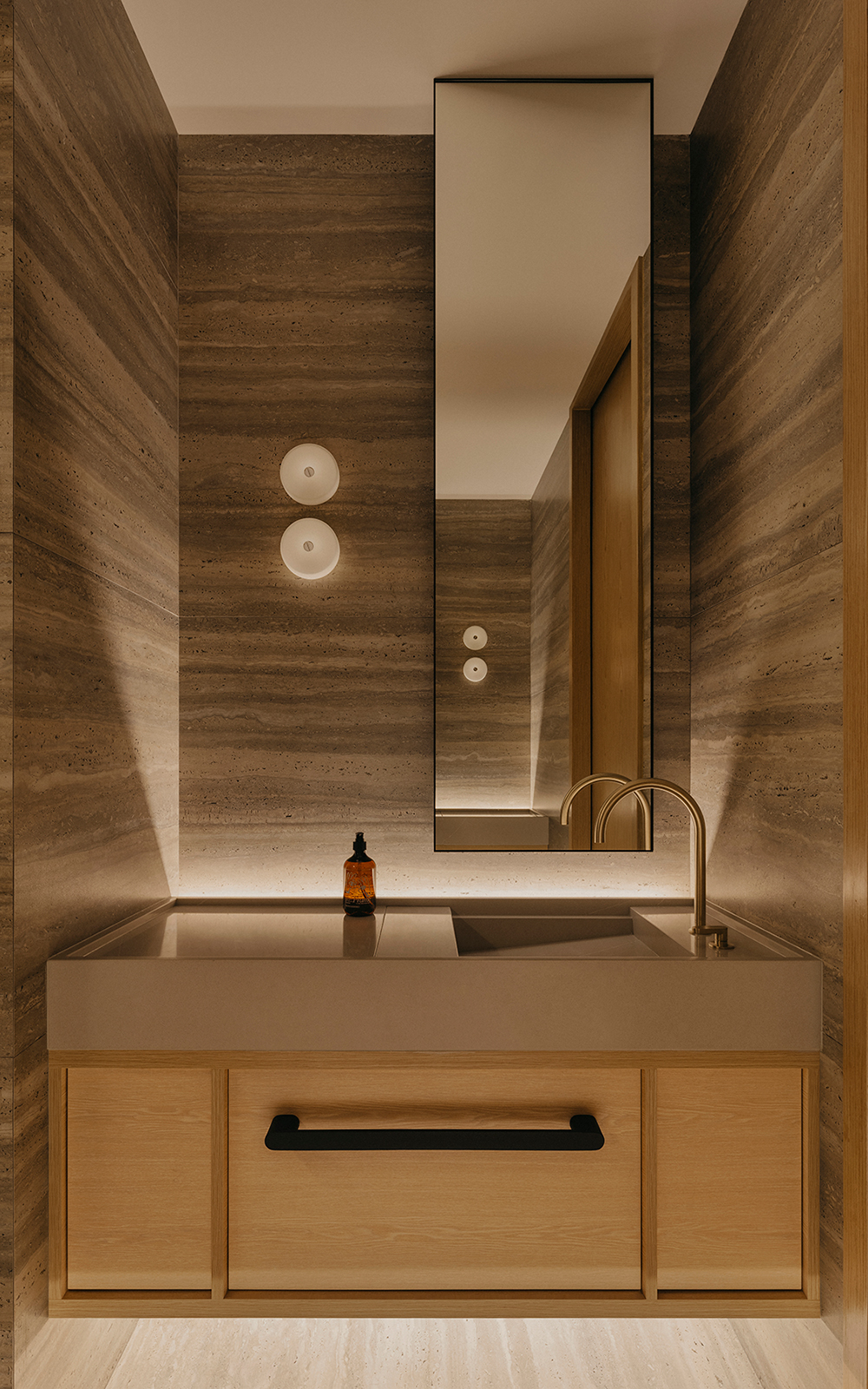 Bespoke craftsmanship informs function with poise in the junior suites, where a custom-built deck and study configuration optimally leverages the generous ceiling height, creating a thoughtful vertical stack for rest and focus. The master suite is completely reimagined from its original shell, with a bathroom conceived as a tranquil sanctuary. Dual vanities mirror each other on opposing sides, while shower facilities are discreetly tucked behind monolithic sintered travertine walls, achieving a measured balance between openness and privacy.